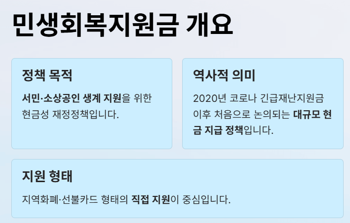 민생회복지원금은 경기 침체로 인한 서민·소상공인 생계 지원을 위한 현금성 재정정책입니다. 2020년 코로나 긴급재난지원금 이후 처음으로 논의되는 대규모 현금 지급 정책으로, 이번에는 지역화폐·선불카드 형태의 직접 지원이 중심입니다.