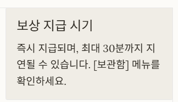 A. 즉시 지급되며, 최대 30분까지 지연될 수 있습니다. [보관함] 메뉴를 확인하세요.
