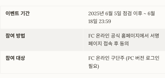| 참여 방법 | FC 온라인 공식 홈페이지에서 서명 페이지 접속 후 동의 |