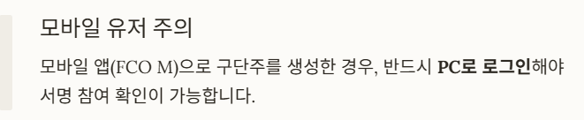 - 모바일 앱(FCO M)으로 구단주를 생성한 경우, 반드시 PC로 로그인해야 서명 참여 확인 가능