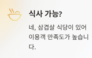 A: 네, 삼겹살 식당이 있어 이용객 만족도가 높습니다.
