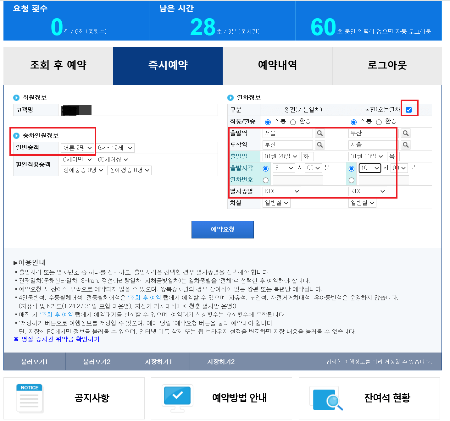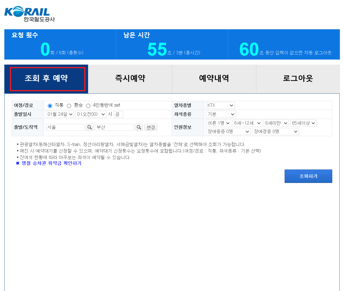 - 코레일의 경우 3분의 제한시간 + 예약시도 횟수 제한(6회까지 가능)이 있습니다.