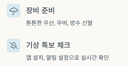 와이퍼 상태 확인, 타이어 마모 점검, 침수 우려 도로 피하기, 주차장 위치 사전 확인하세요.