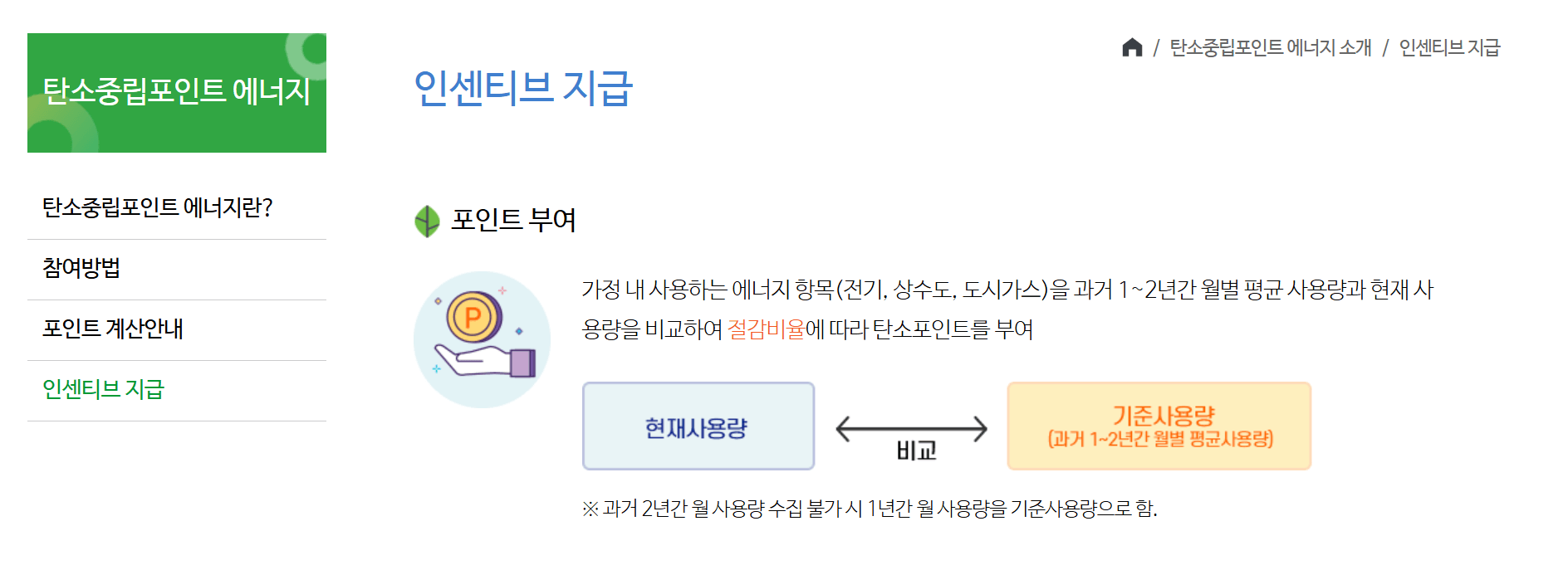현재 사용량을 비교하여, 절감비율에 따라 탄소 포인트를 부여합니다.