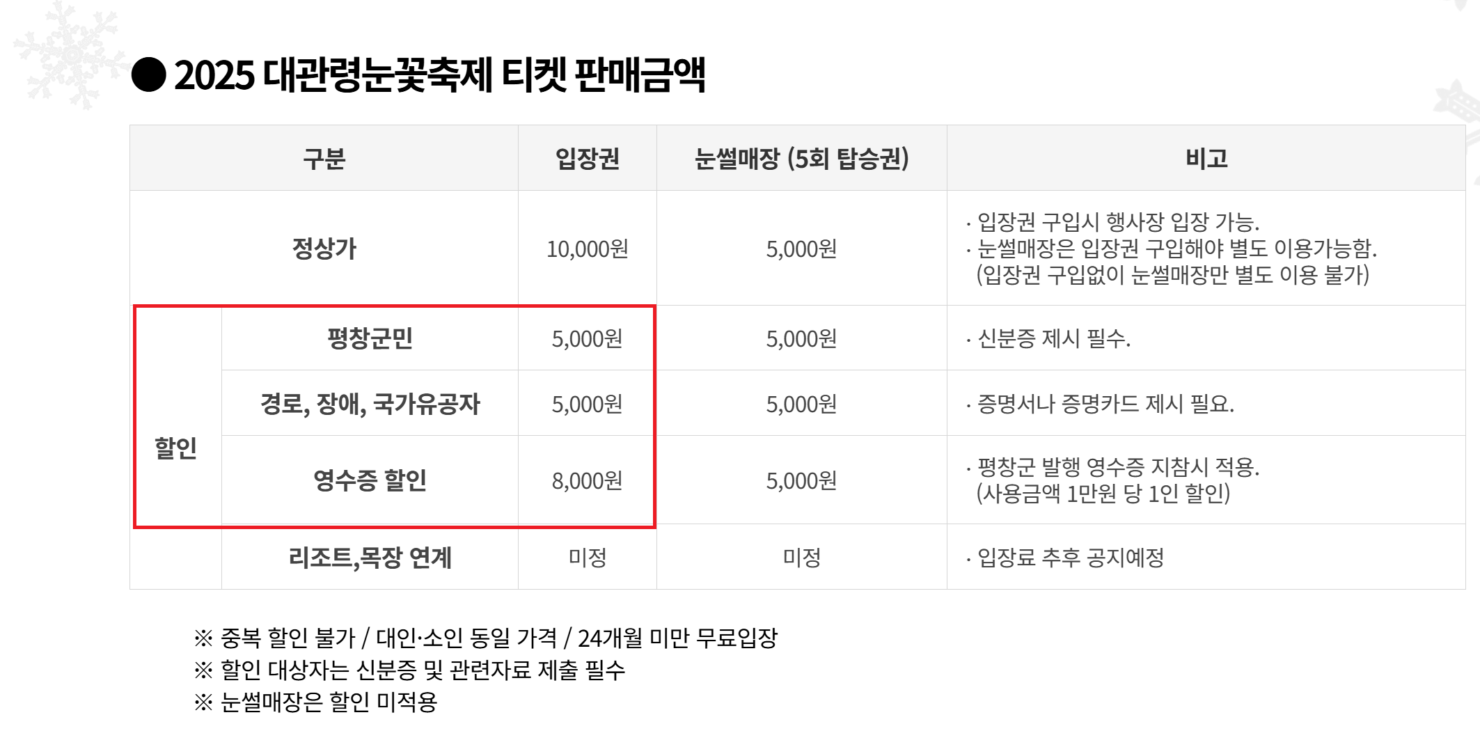 - 평창군민 할인 : 50% 할인 적용(신분증 제시)