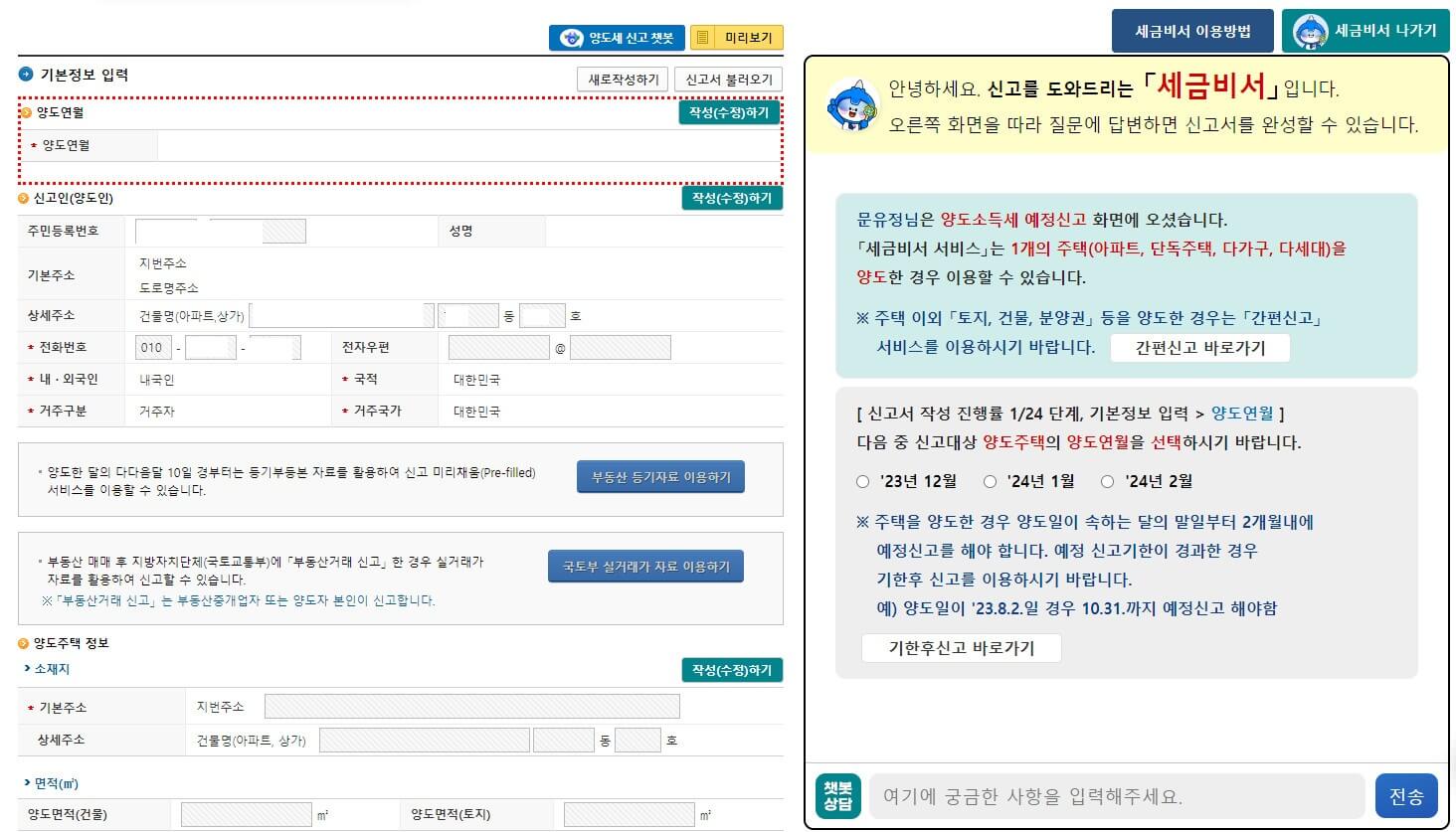 신고인부분과 양도주택정보 등을 작성후 제출합니다.