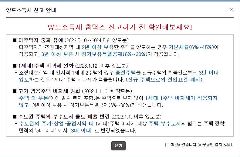 저는 1개주택양도신고를 클릭해보았습니다. 양도소득세 신고 안내 팝업창이 뜹니다.