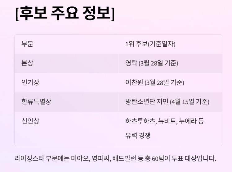 라이징스타 부문은 2022년 1월부터 2024년 12월 사이 데뷔한 3년 차 그룹이 투표 대상입니다.