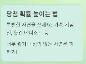 - 신청 이유 간략히 작성 (기념일, 가족 행사 등 구체적이면 당첨률 상승!)