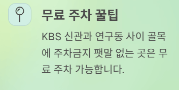 | 팁 | KBS 신관과 연구동 사이 골목에 ‘주차금지 팻말 없는 곳’ → 무료 주차 가능 + 도보 1분 거리 |